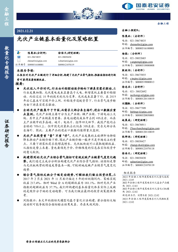 【国泰君安证券】【20211221】数量化专题报告:光伏产业链基本面量化及策略配置-23页