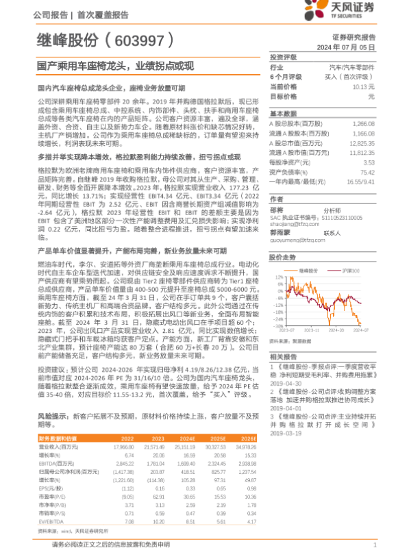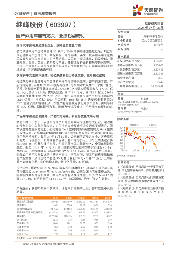 【天风证券】【20240705】继峰股份(603997)国产乘用车座椅龙头,业绩拐点或现-27页