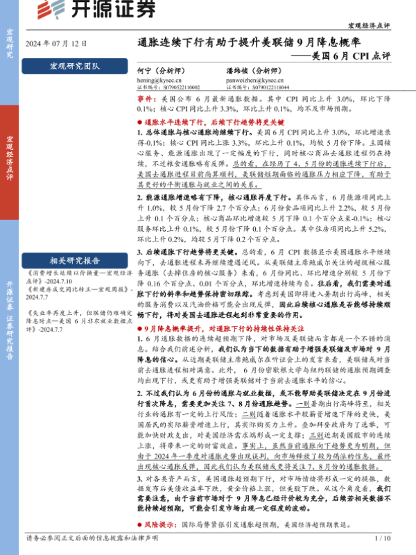 【开源证券】【20240712】美国6月CPI点评:通胀连续下行有助于提升美联储9月降息概率-10页